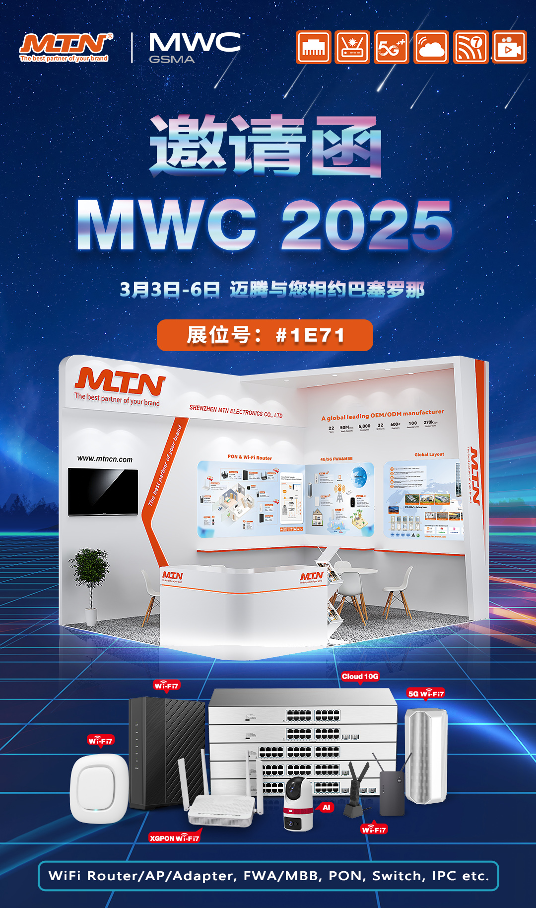 2025年世界移動通信大會(25MWC)盛大啟幕在即,這是一場全球矚目的通信行業(yè)盛會,邁騰電子攜Wi-Fi 7 Router、4G/5G FWA&MBB、AI-IPC等一系列產(chǎn)品和技術(shù)亮相。在此,我們誠摯地邀請您蒞臨我們的展位,一同探索通信科技的無限可能!