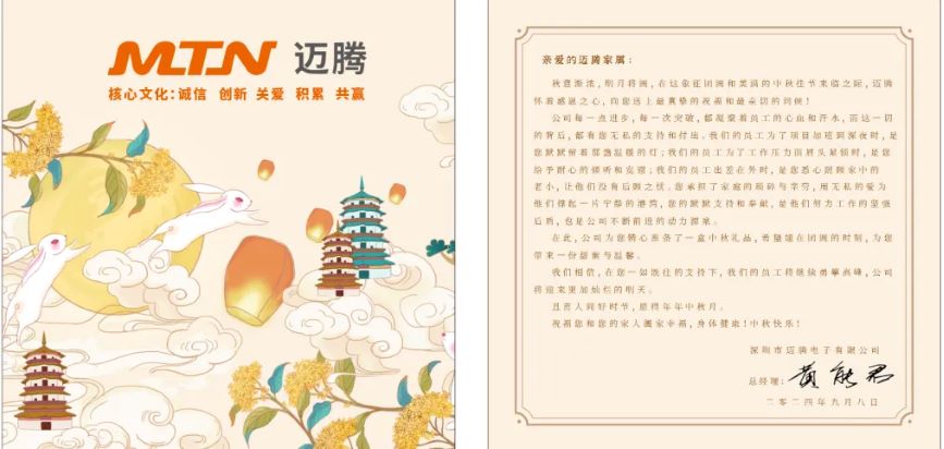 明月寄相思,中秋共團(tuán)圓。在這個充滿溫情與詩意的傳統(tǒng)佳節(jié)——中秋節(jié)來臨之際,邁騰電子及各子分公司為全體員工精心準(zhǔn)備了中秋節(jié)福利,向每一位辛勤付出的員工及其家人送上最誠摯的祝福和問候。